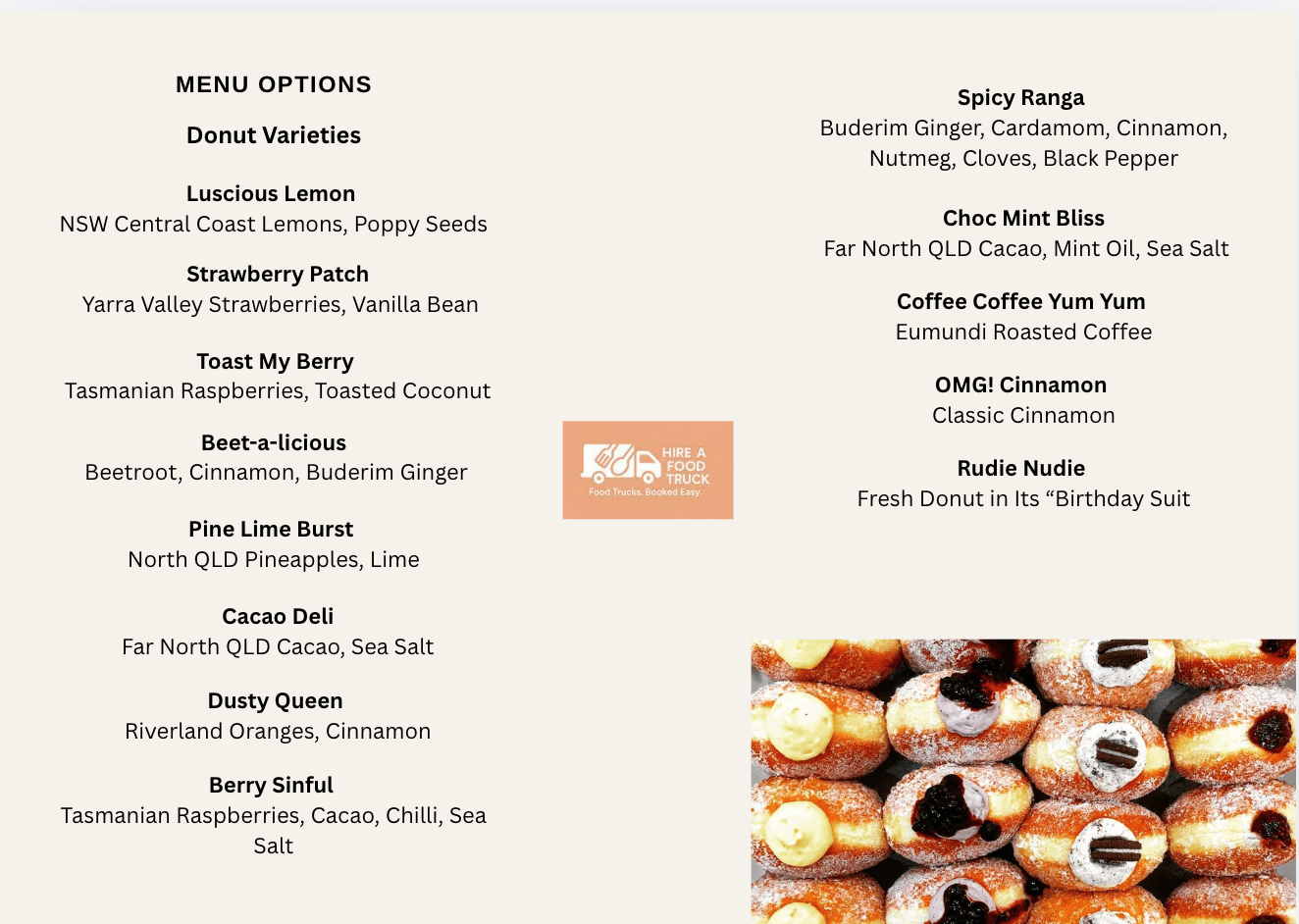 Every donut is served warm, fluffy, and delicious — the perfect sweet finish to weddings, corporate functions, festivals, and parties. With so much variety, the Donut Truck is guaranteed to put a smile on every guest’s face.