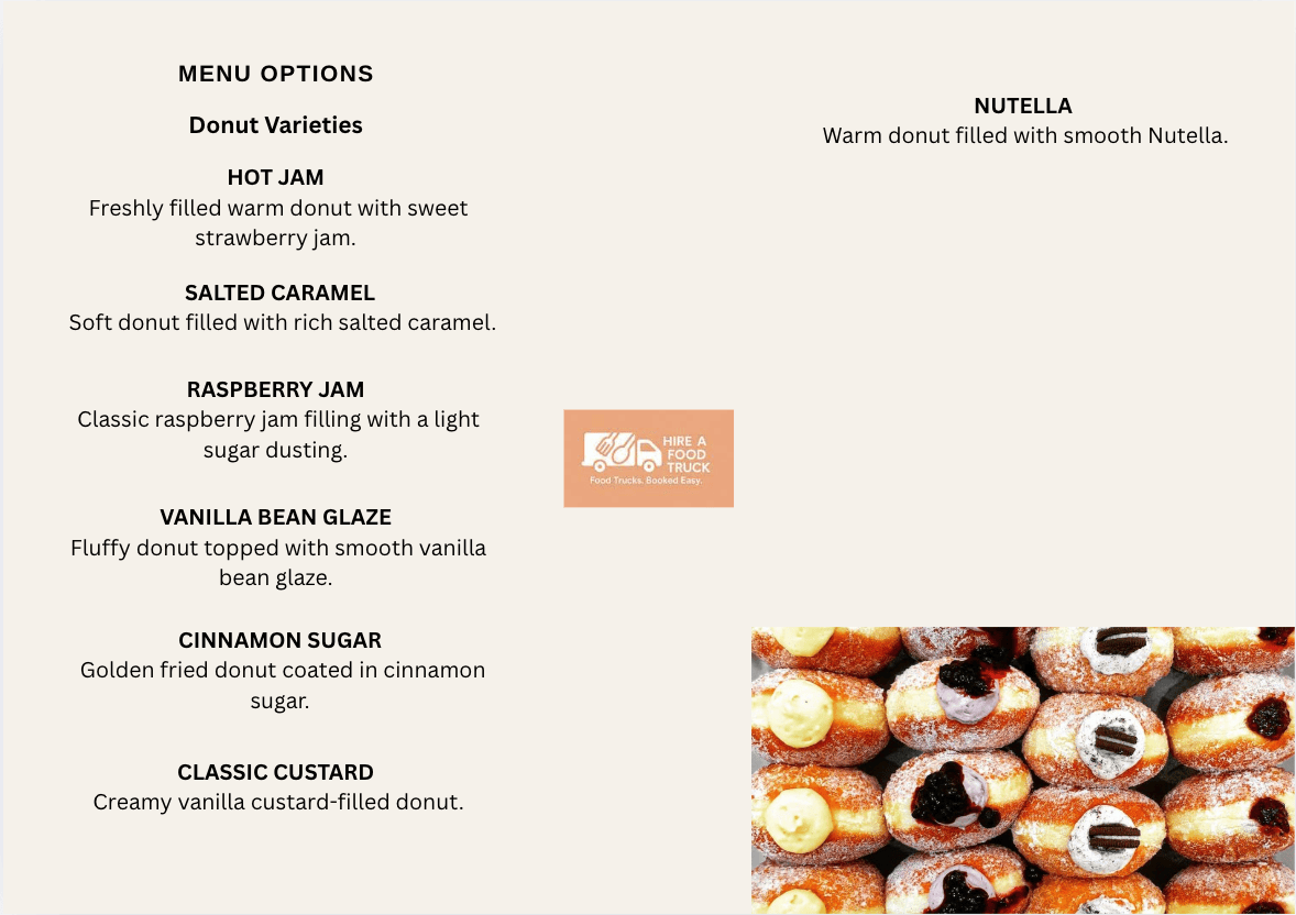 Bring the sweet smell of fresh donuts to your next event with our Donut Food Truck — serving golden, fluffy treats that guests won’t be able to resist. Made fresh on-site, our donuts are light, soft, and covered in everything from sugar to frosting, fillings, and crumbs.