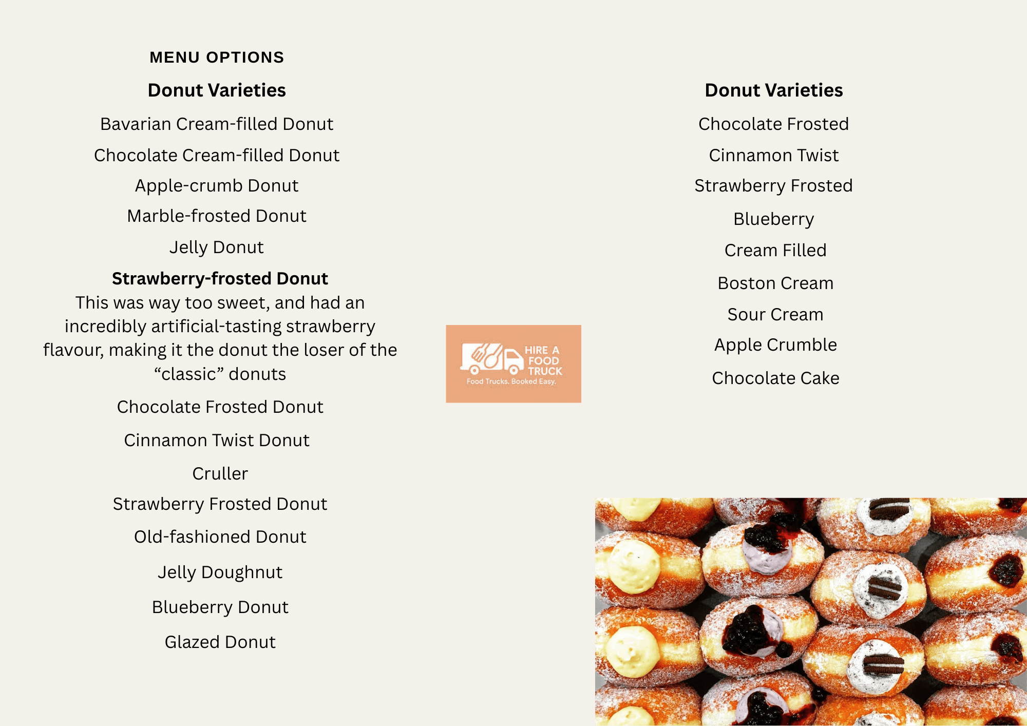 Bring the sweet smell of fresh donuts to your next event with our Donut Food Truck — serving golden, fluffy treats that guests won’t be able to resist. Made fresh on-site, our donuts are light, soft, and covered in everything from sugar to frosting, fillings, and crumbs.