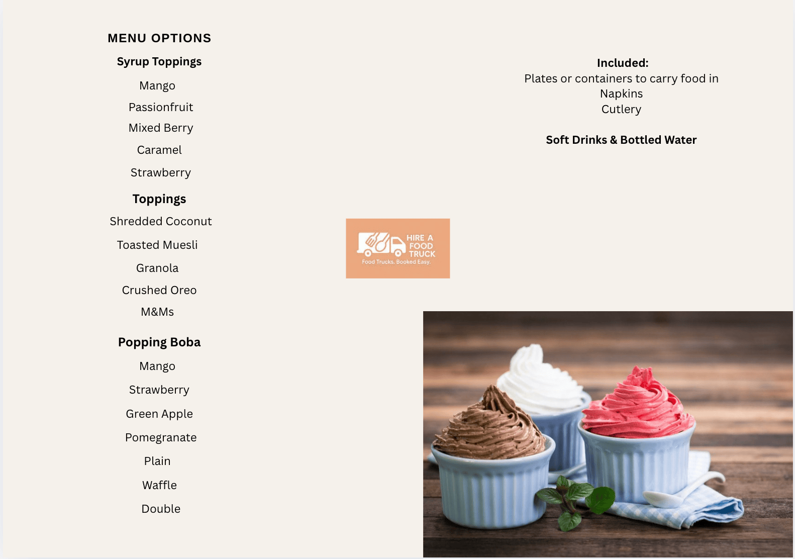 Add a refreshing twist to your next event with our Frozen Yoghurt Food Truck. Guests can enjoy creamy yoghurt swirls topped with fresh seasonal fruits, crunchy granola, chocolates, or sweet sauces — all prepared on-site and served in eco-friendly cups.