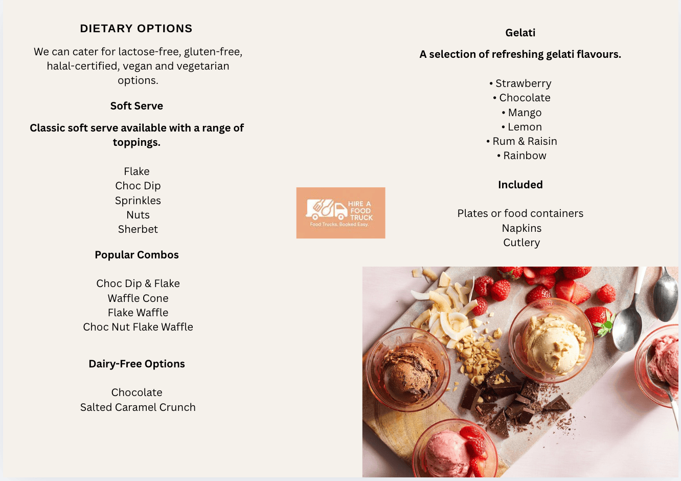 To add a little fun, we serve choc-dipped waffle cones, sprinkles, and candy toppings — guaranteed to delight kids and adults alike.