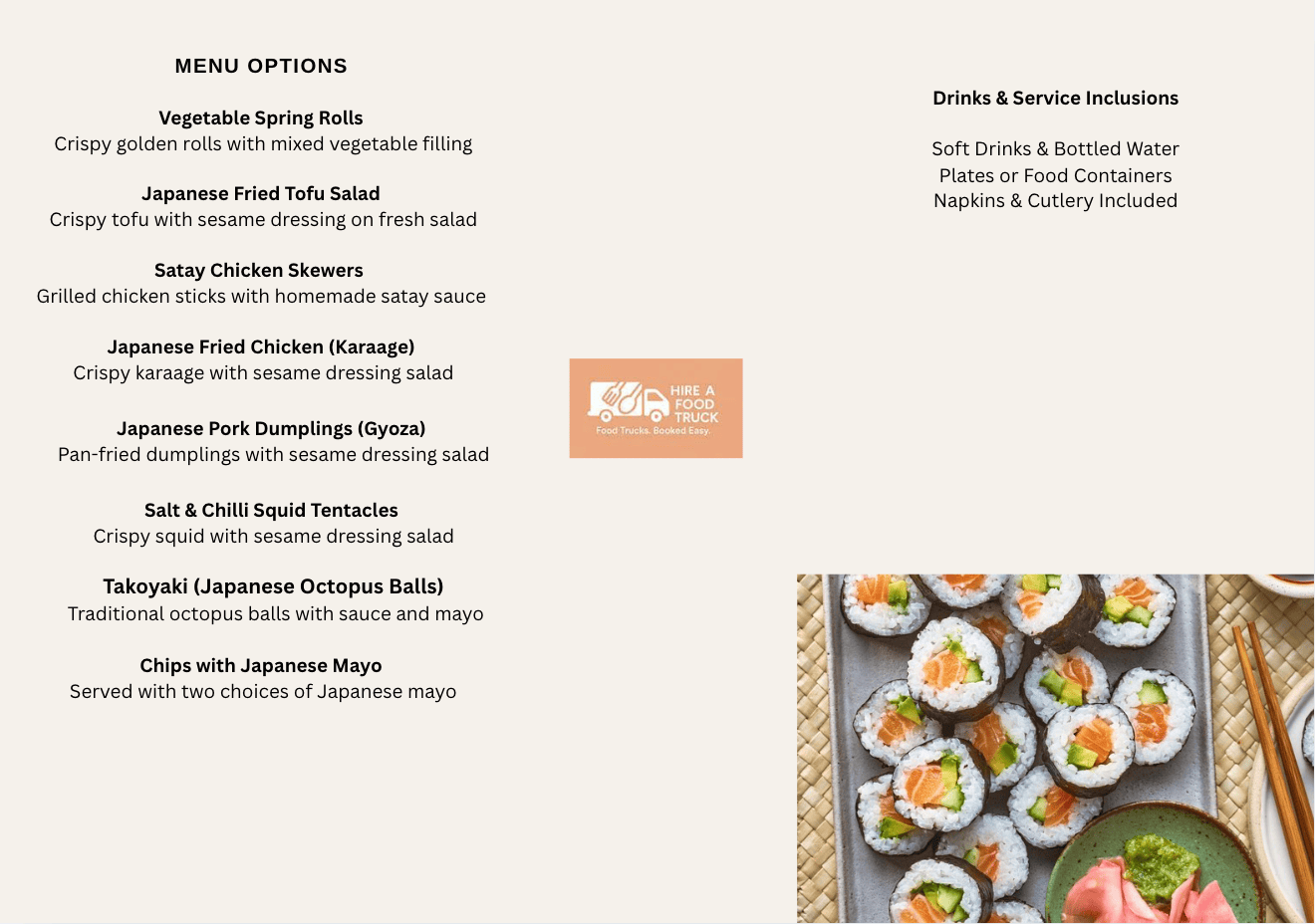 Experience the vibrant flavours of Japan with our authentic Japanese food truck, serving up a delicious mix of street-style favourites and modern classics. From freshly made teriyaki chicken and beef yakitori skewers to crispy karaage chicken, gyoza dumplings, and steaming bowls of Japanese fried rice, every dish is crafted using fresh local produce and traditional Japanese sauces. Perfect for corporate functions, weddings, school events, and festivals, our Japanese food truck brings a taste of Tokyo’s bustling street markets straight to your celebration.