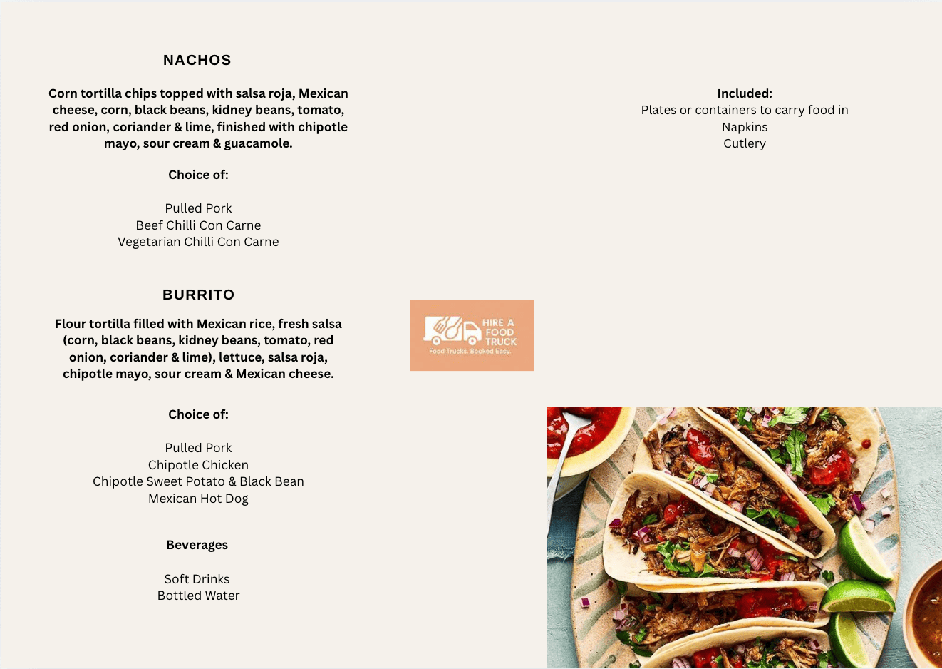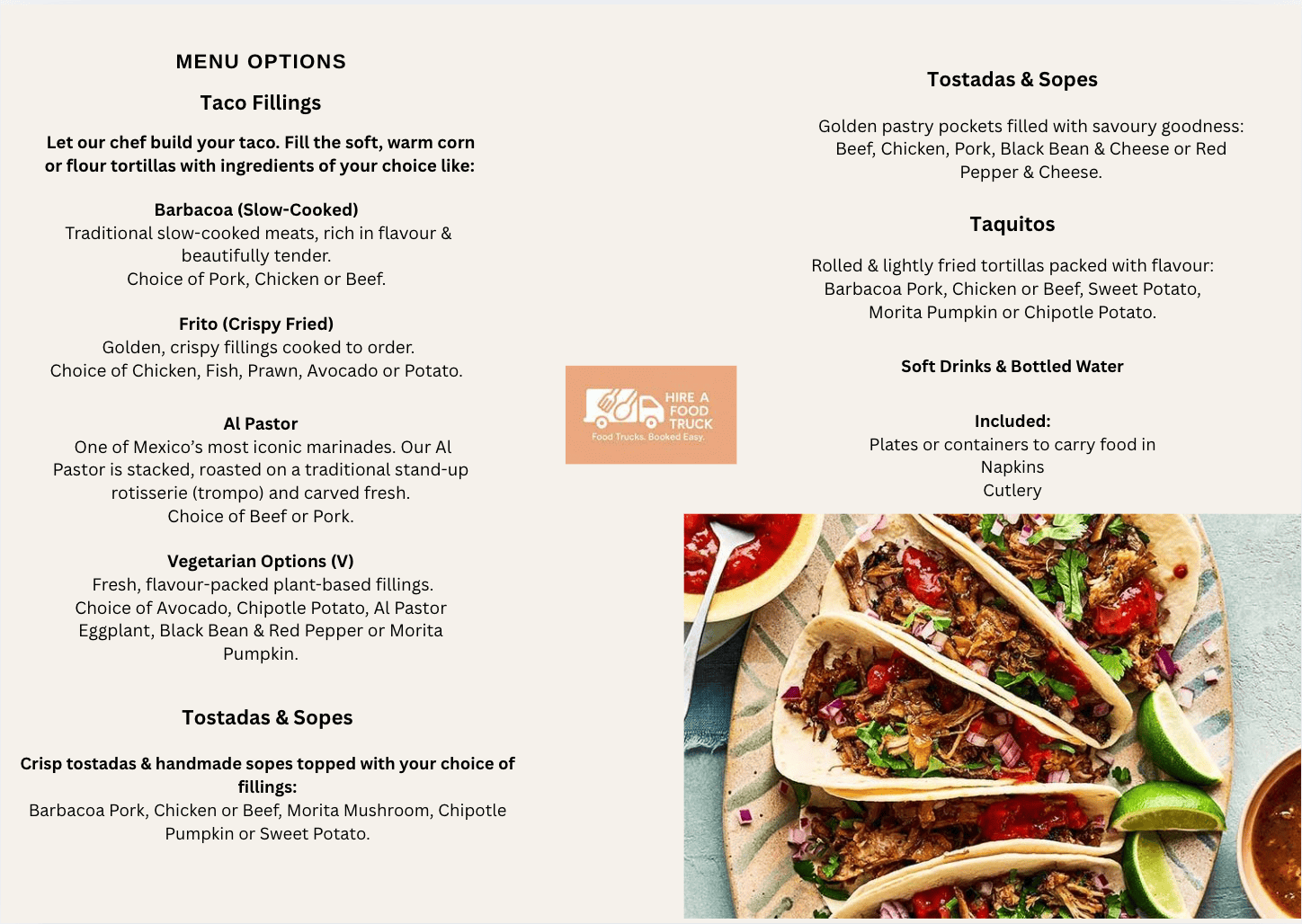 Spice up your event with the bold, vibrant flavours of authentic Mexican street food. Our food trucks serve up a mix of savoury favourites and vegetarian delights, all crafted to deliver a true taste of Mexico.