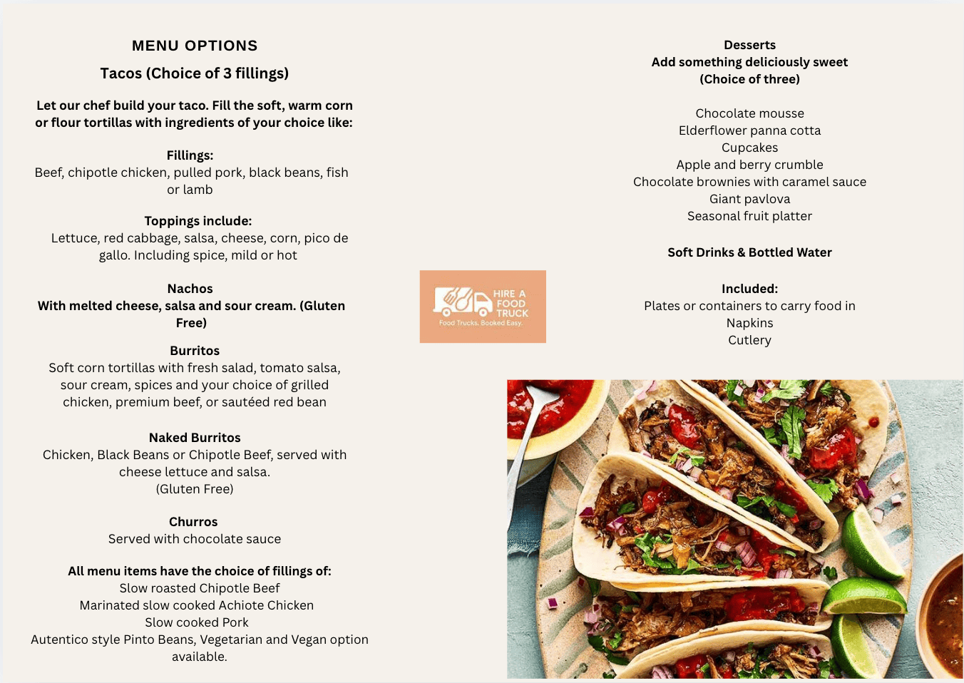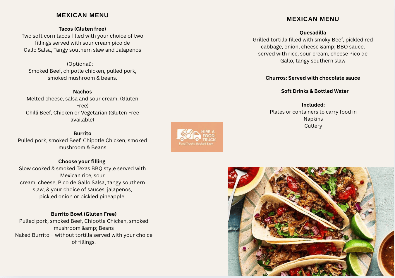 Spice up your event with the bold, vibrant flavours of authentic Mexican street food. Our food trucks serve up a mix of savoury favourites and vegetarian delights, all crafted to deliver a true taste of Mexico.