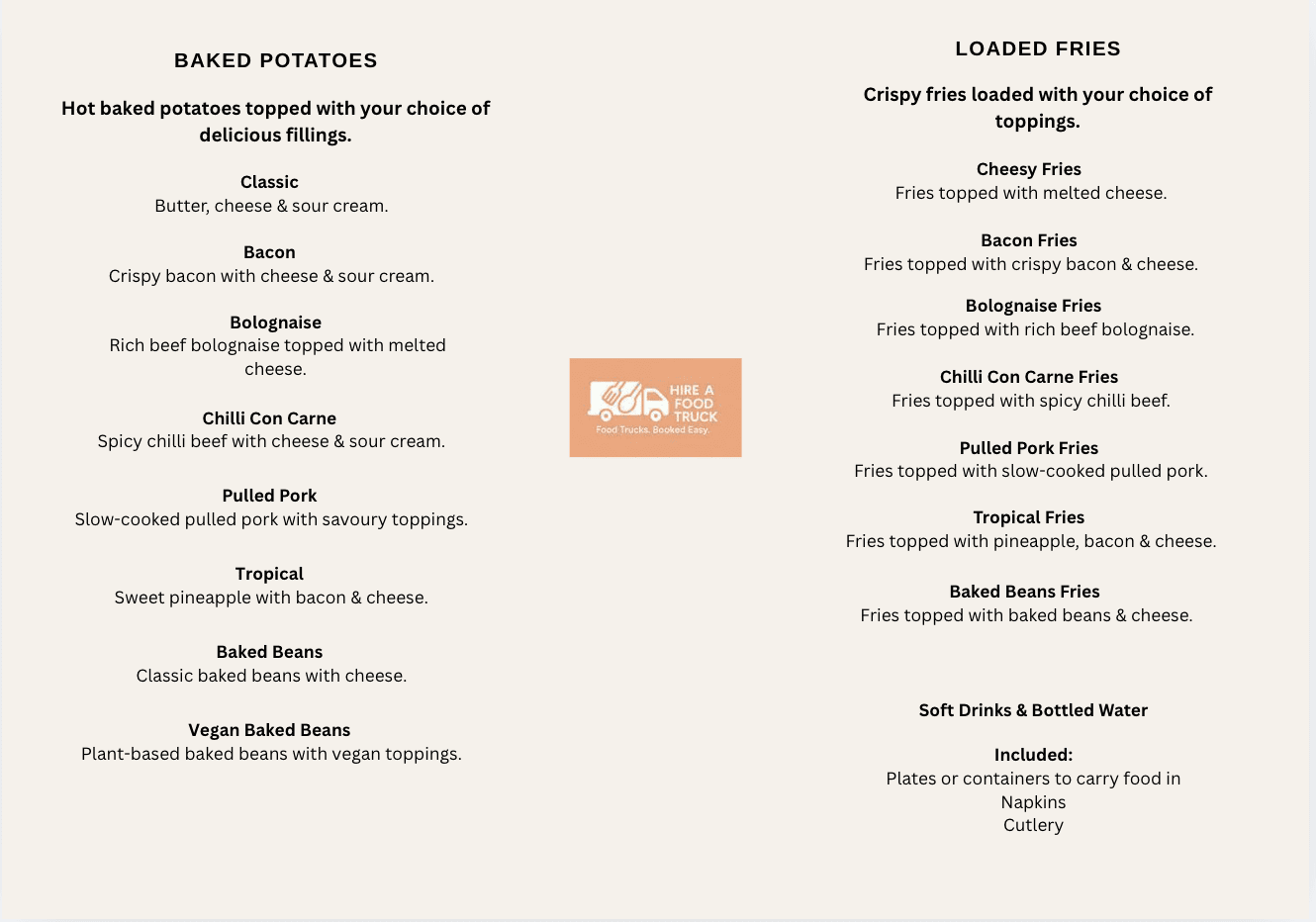 Whether you’re after a budget-friendly catering option or an interactive street food favourite, our potato truck has you covered.