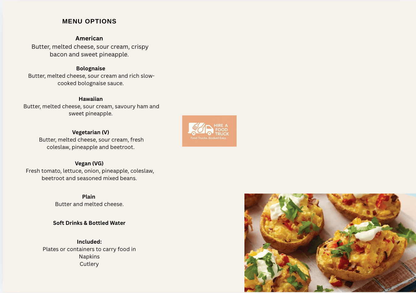 Whether you’re after a budget-friendly catering option or an interactive street food favourite, our potato truck has you covered.