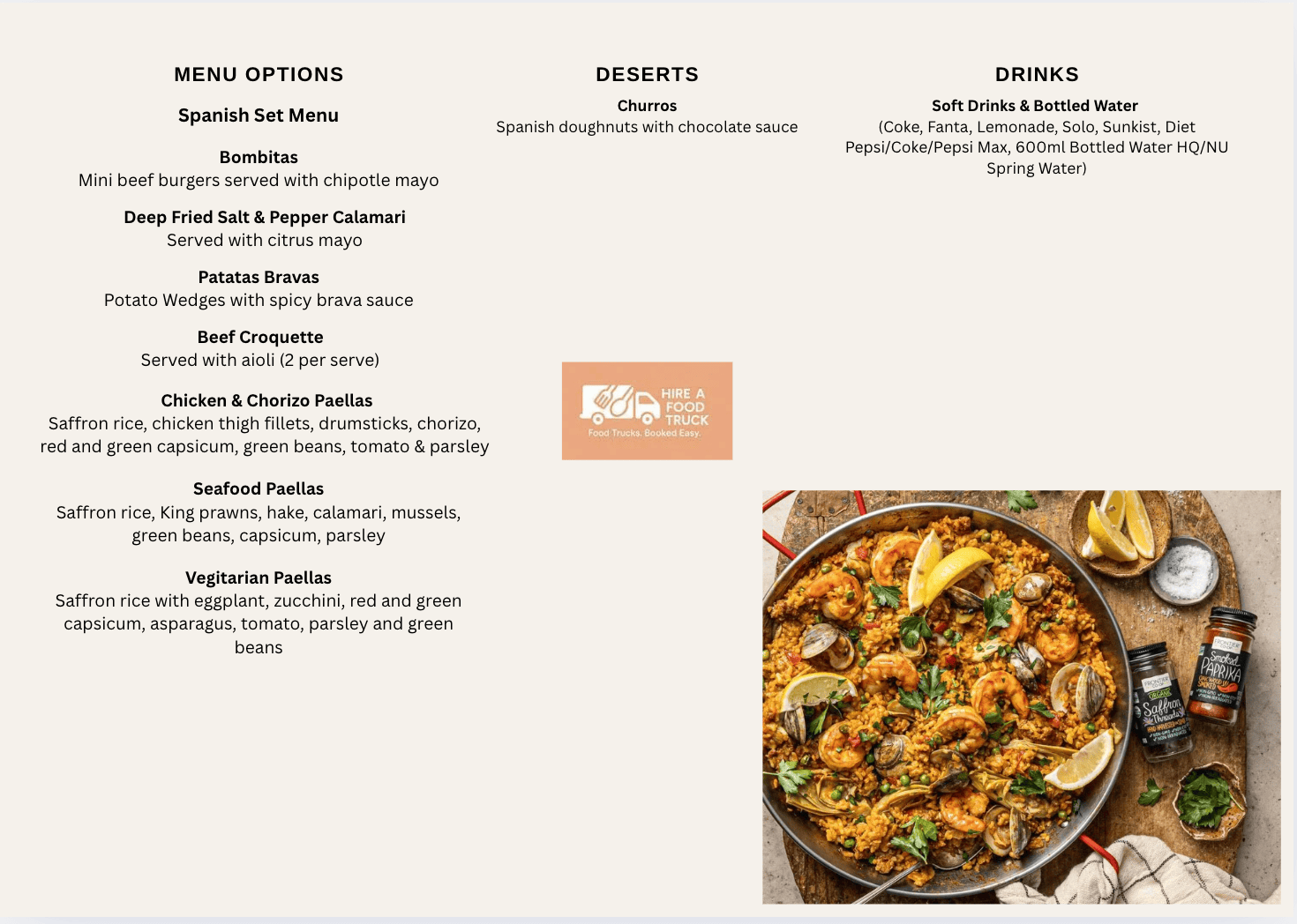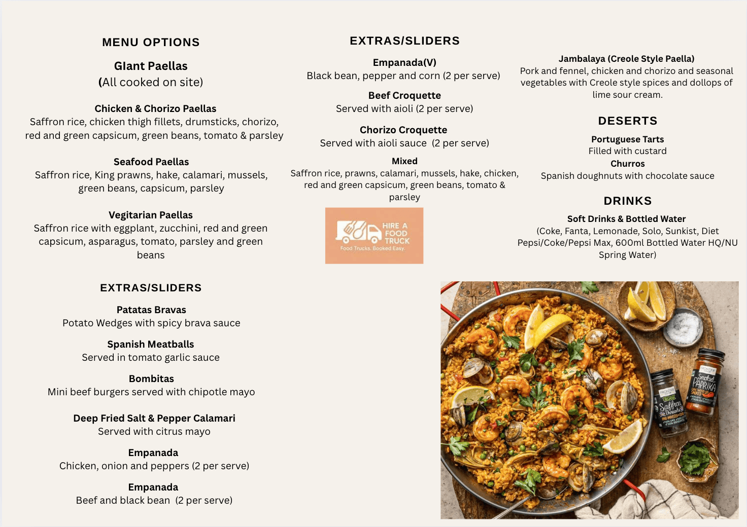 Beyond paella, we also offer a selection of Spanish-inspired street food and vegetarian delights, perfect for creating a festive and flavourful event experience.